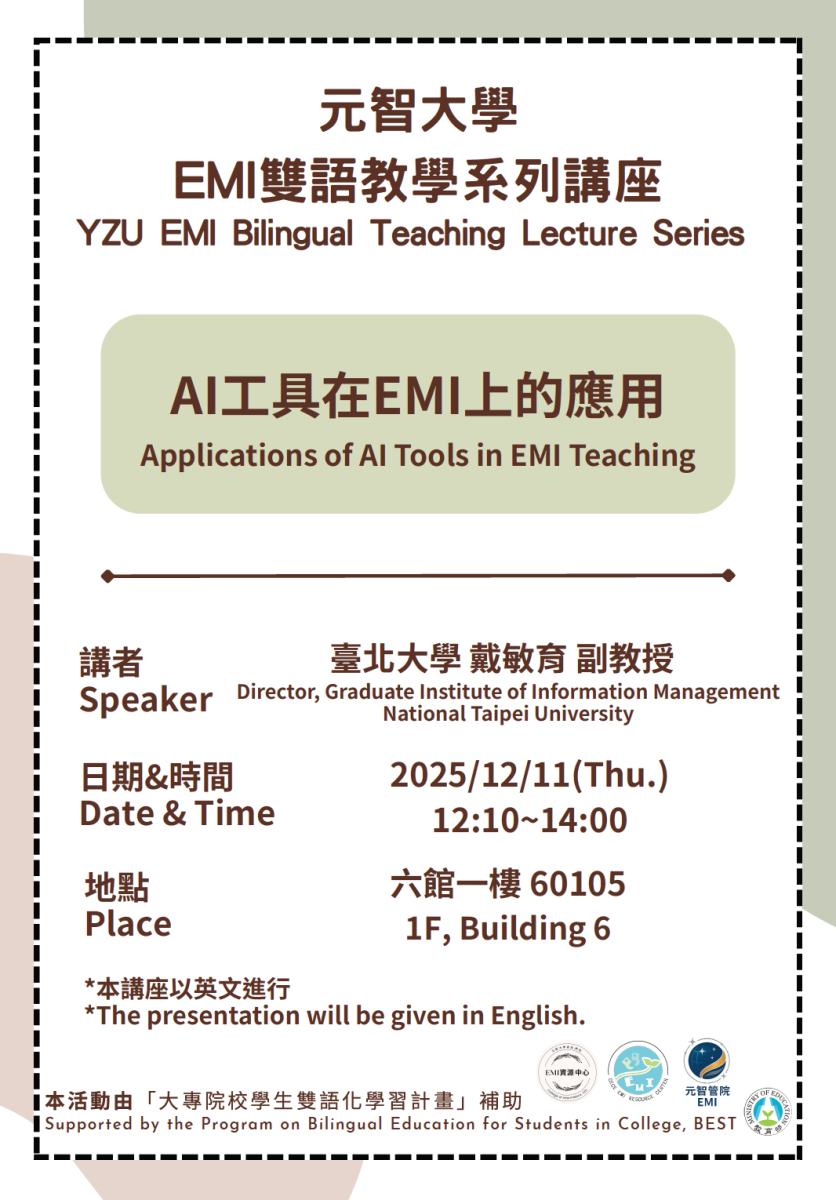 一、為增進EMI課程教學技巧,並提升大專校院教師EMI教學能力,本校於114學年度第1學期辦理「EMI雙語教學系列講座」,歡迎各大專校院EMI教師報名參與。