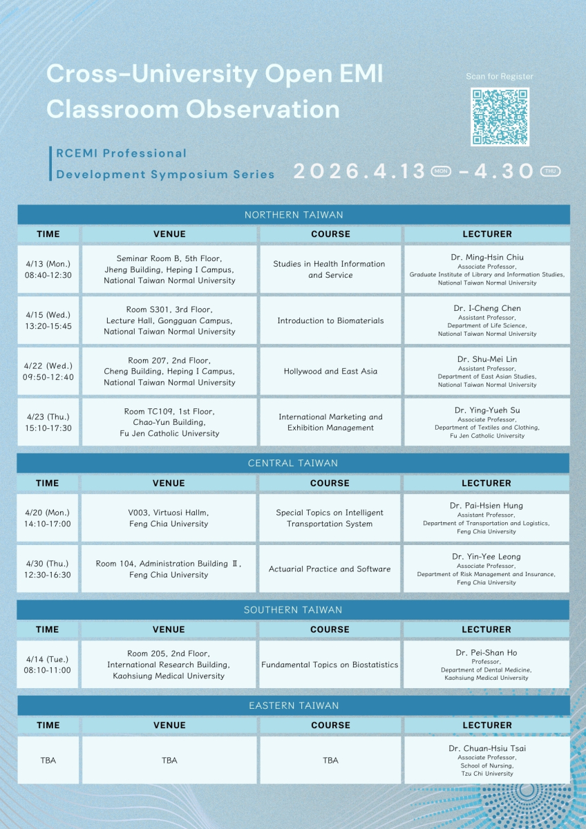 (一)跨校公開觀議課:邀請本中心曾於 2025 年暑期赴美國德州大學奧斯汀分校,以及於 2026 年赴澳洲新南威爾斯大學參與培訓並返臺之 EMI 教師公開展示課堂,提供 EMI 教師具體之教學示範與實務參考。各場次皆邀請相關專家學者擔任與談人,於課後進行觀議與交流,共同探討 EMI 教學設計、課堂實踐及教學品質精進之可能方向。