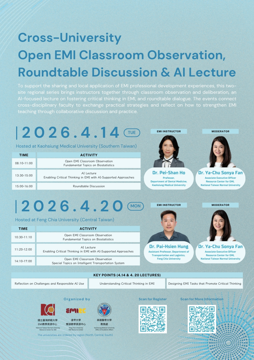 一、本校 EMI 教學資源中心(以下簡稱本中心)於 114 學年度第 2 學期,與本校雙語教育推動辦公室、輔仁大學織品服裝學院、國立臺灣大學雙語教育中心、國立臺北大學商學院辦公室、逢甲大學雙語教學資源中心、慈濟大學外語教學中心、國立中正大學語言中心、中華醫事科技大學教學發展中心、高雄醫學大學教務處及國立高雄師範大學共同辦理 18 場「跨校公開觀議課」。其中,與逢甲大學及高雄醫學大學亦合作辦理圓桌會議及 AI 講座之一日系列活動。